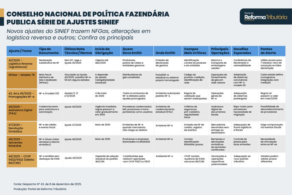 O Confaz publicou o Despacho Nº 42, de 8 de dezembro de 2025, que traz novos ajustes do SINIEF que atualizam procedimentos fiscais